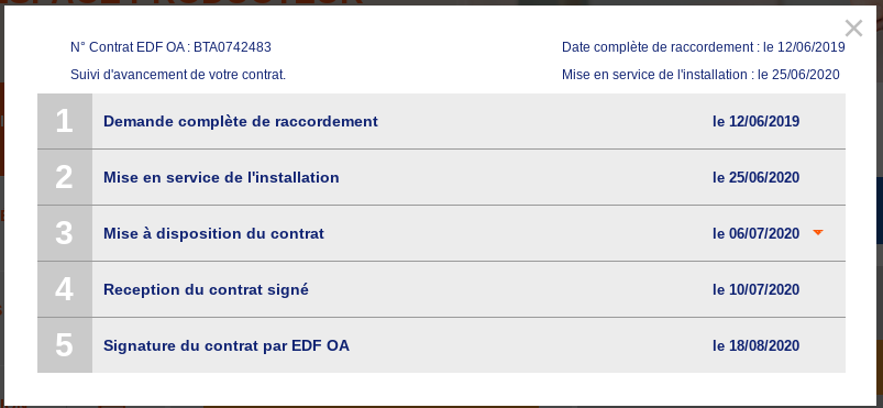 Dans ce cas nous vous invitons à leur transférer par email votre preuve de mise en service Enedis. Soit c'est un email que vous avez reçu soit vous avez directement accès à votre demande de raccordement sur l'espace Enedis et vous la téléchargez. L'adresse email de contact de EDF OA pour le solaire est la suivante : oa-solaire@edf.fr